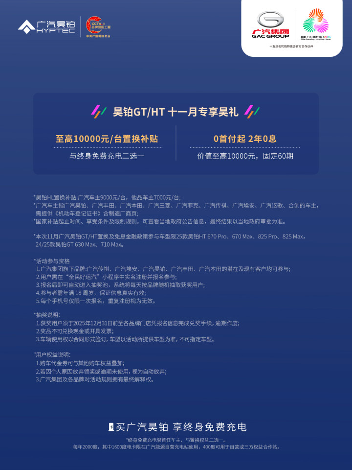 现在入手不仅能抓住2026年的购置税退坡前的最后窗口期,立省近万元,还能享受昊铂的“铂金服务”:终身三电质保、终身免费基础保养、车载基础流量终身免费、终身送桩到家等。11月购车还有“0首付起,2年0息”金融政策,至高10000元置换补贴。双十一期间下订还能参与抽奖问道管理,最高可赢取昊铂HT一年使用权。说到底,在20万级大五座纯电SUV里,昊铂HT不靠噱头,而是用实打实的空间、续航、配置和权益,把长期用车成本和体验都考虑进去了。