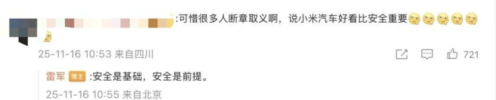 11月16日,小米汽车雷军连发多条微博,重申小米汽车的安全设计理念;有网友断章取义,说小米汽车好看比安全重要,雷军回应称:安全是基础,安全是前提利鸿网,安全高于一切。
