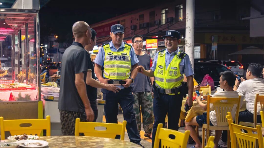 南海公安民辅警到辖区人流密集的宵夜街巡逻,与店家、食客拉家常并开展安全防范宣传,让浓浓的“烟火气”萦绕着满满的“安全感”。