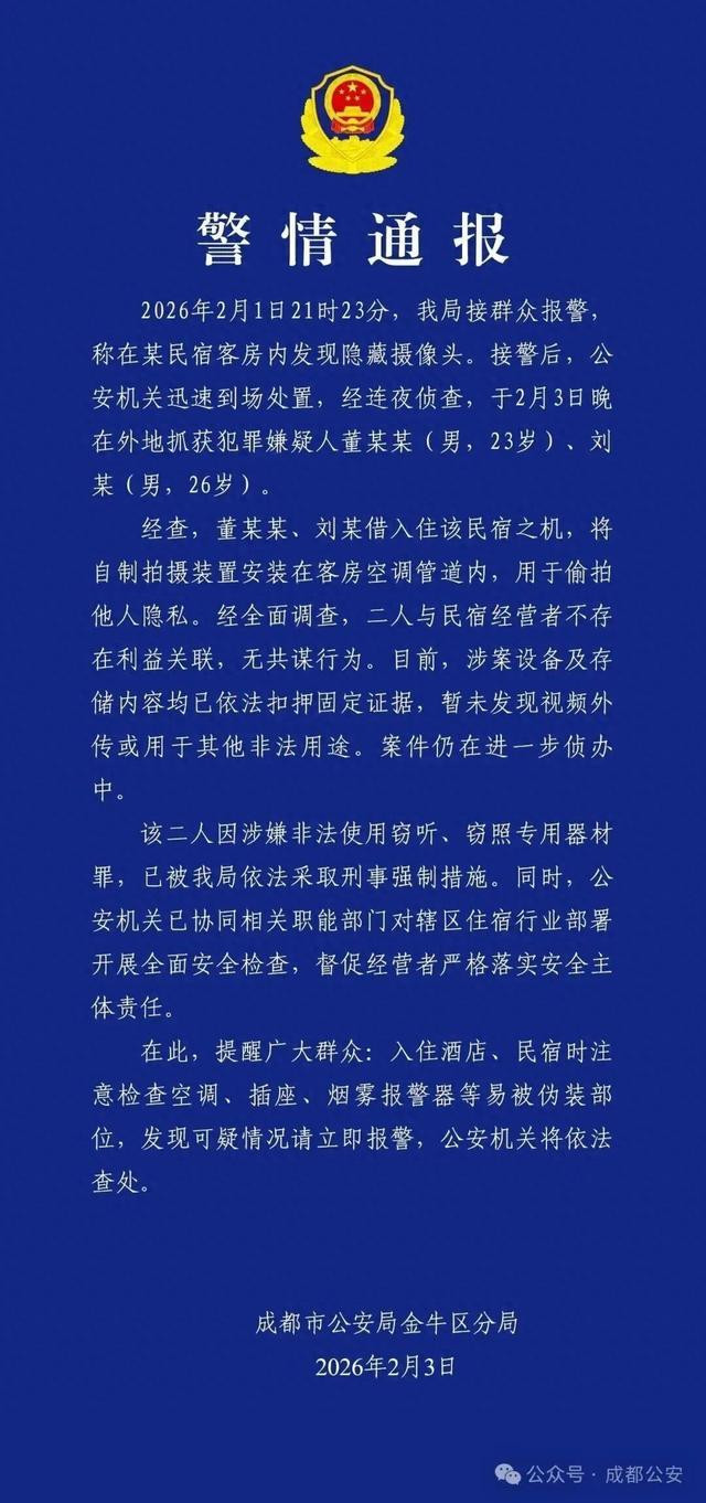 2026年2月1日21时23分,我局接群众报警称在某民宿客房内发现隐藏摄像头。接警后,公安机关迅速到场处置,经连夜侦查,于2月3日晚在外地抓获犯罪嫌疑人董某某(男,23岁)、刘某(男,26岁)。